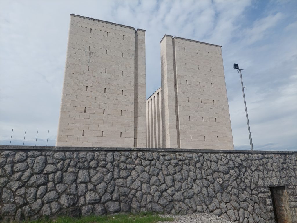 »To je vendar veličasten spomenik Ara pacis mundi, posvečen vsem padlim v vseh vojnah in zlasti v drugi svetovni vojni. Postavili so ga leta 1950, odprt je bil 6. maja 1951.« V notranjosti ograjenega prostora je pravi oltar in žari – lesena in bronasta z latinskim napisom in prevodom v italijanščino: »Sovraštvo proizvaja smrt, ljubezen ustvarja življenje.«