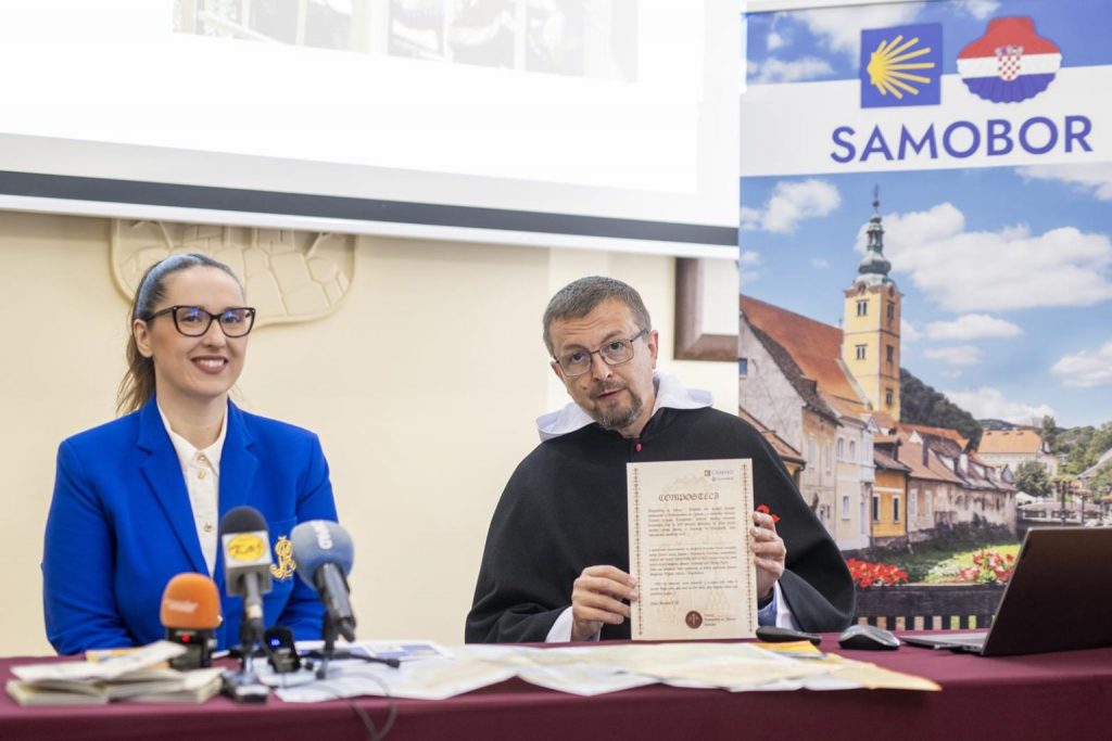 Petra Škrobot (županja mesta Samobor) in Vedran Pražen (tajnik Bratovščine sv. Jakoba Hrvaške) ob prvi predstavitvi Camina Samobor